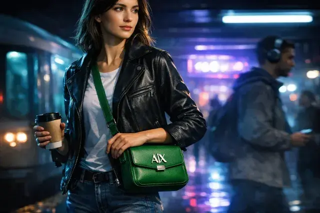 Armani Exchange introduces a green shoulder bag crafted for hands-free convenience in everyday routines. The design features a metal monogram logo and front flap, blending bold aesthetics with practical functionality. This accessory reflects the brand's push toward versatile pieces that suit urban lifestyles amid rising demand for adaptable fashion.